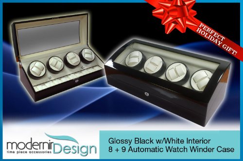 NOTE: Item is New In Box. For some reason Amazon did not give me an option to list as new item rather than list as Used-Like New. Brand new item. New in box! For those who is a watch collector or just like to find some place to store your high end time piece, brand new is this unique Glossy Black 8 + 9 Automatic Watch Winder Case with White Interior Leatherette finishing. Keep your self-winding watches precise with this automatic watch winder! Simply place your favorite automatic watches on the winder then walk away. This is one of the best and/or alternative way to store your precious time piece. You can also store any small jewelry pieces with one of our 9 leatherette pocket slots. Great for your home or office or as a gift! You get the same quality as if you were to get a high end Steinhausen, Wolf Design, or Stockinger but a competitive price! Our watch winder winds your watch automatically-without over winding! The built-in timer rotates watches through a choice of pre-programmed sequences so they won't over wind. Our watch winder features a built-in QUIET motor that automatically keeps your watches accurate and on-time. Choose clockwise, counterclockwise or bi-directional rotation. AC/DC Power Plug with on/off switch on back panel Key Features This watch winder has 4 different program settings. Knob program settings: ·1st stop: unit is off. ·2nd stop: winder will rotate clockwise for 2 minutes and rest for 6 minutes. ·3rd stop: winder will rotate counter-clockwise for 2 minutes and rest for 6 minutes. ·4th stop: winder will rotate clockwise for 2 minutes, rest for 6 minutes then it will rotate counter-clockwise for 2 minutes, rest for 6 minutes. ·5th stop: winder will rotate clockwise for 5 minutes then counter-clockwise for 5 minutes. This cycle will repeat continuously for 3 hours then rest for 9 hours. Please take a look at provided images.